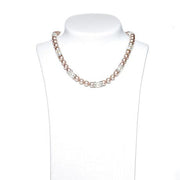 An elegant charming necklace which compromises of 8mm Almond pearl 8mm silver plated Rondelles nestling an ivory pearl. The piece is finished with sterling silver findings. A modern take on the pearl necklace its sure to be a showstopper. This piece would be the perfect finishing touch to your mother of the bride outfit.
