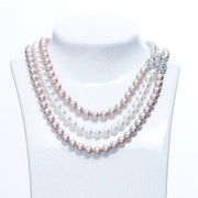 An elegant pearl triple strand necklace with vintage inspired crystal detailing on one side of the neck. This necklace consists of 6mm pearl and 8mm white & Almond pearls.