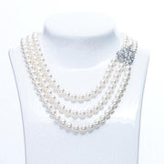 An elegant pearl triple strand necklace with vintage inspired crystal detailing on one side of the neck. This necklace consists of 6mm pearl and 8mm white pearls.