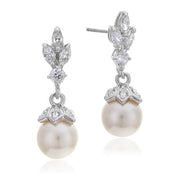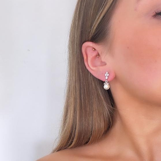 Dainty 6mm pearl drop bridal earrings with an intricate crystal detail in the ear. These timeless earrings are the perfect compliment to vintage inspired dresses.