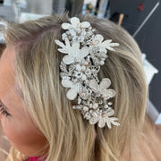 For a soft and romantic look on your big day, the Ela is the piece to wear. The silver tone lace-effect plates are woven together to give this piece its intricate, asymetrical look. To compliment, delicate handmade flowers of freshwater pearl and crystal are laced throughout the piece, whilst additional crystal encrusted leaves spray from the sides to add that extra sparkle! Delicate peach freshwater pearls are the final touch, making it the perfect summer bridal hair accessory.