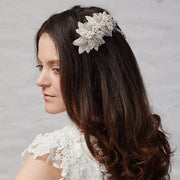Comprising of two combs, one large and one small, and two crystal drapes that join these combs together, this is the ultimate statement drape! The combs are made from a mix of exquisite, appliqué leaves with silver seed bead detail, crystal encrusted leaves and finished with pearl flowers, whilst the drapes are a mix of crystal bicones, pavé crystal balls and crystal rondells - for a perfect, glistening finish! This piece is dramatic in size yet so elegant in its shape.