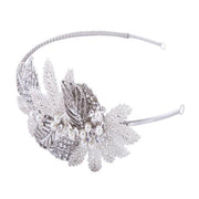 These bridal hair bands comprise a mix of exquisite, appliqué leaves with silver seed bead detail, crystal encrusted leaves and finished with pearl flowers down the centre, this piece is dramatic in size yet so elegant in its shape. The rhodium plated leaves not only give this piece its classic, vintage look, but also serve to perfectly contrast the bright crystals that inlay this piece. This is the perfect piece for any dress, whether it is a simple silhouette or a ballgown style, but especially those with appliqué detail.