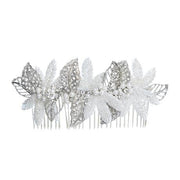 Beautifully handcrafted crystal and pearl haircomb with intricate leaf design. Each rhoduim plated leaf is encrusted with mounted on a 11cm comb . It also has pearl flowers and with a handbeaded leaf detailing is perfect for wearing with any wedding gown.