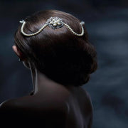 This stunning hair accessory features two pins at the side of the head, linked together by an intricate pearl drape met in the centre by another vintage inspired comb. Delicately handmade to create this graceful drape is a series of pearls strung on sterling silver wire. The pins on either side are made of ivory beads and sterling silver wire woven into delicate floral shapes, This piece is ideal for a vintage style dress.