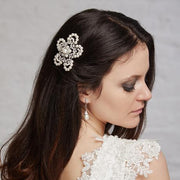 This stunning hair accessory features the georgia brooch component made using crystals and pearls embedded into a rhodium based sterling silver cast. This delicately handmade comb has beautiful pearls looping in petal shapes around the exterior to add a floral effect to the piece which creates a graceful comb. This piece is ideal for a vintage style dress.