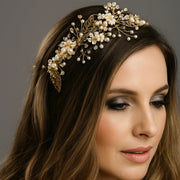 A hair crown created with clear crystals and ivory white pearls, along with intricate almond pink and white pearl flowers.