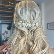 This beautiful handmade comb consisting of intricate wire work, fresh water blush pearls, gold plated leaves and crystals is all mounted on gold plated settings.