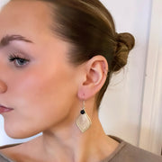 Made in Cork as part of our handmade collection these stunning Gold and white thread Statement Earrings with a black pearl are a must have. Perfect for any occasion . lightweight on the ear. Contact us for customised choices for this product.