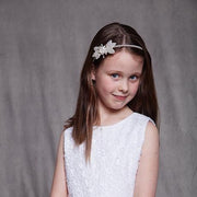 Beautifully handcrafted crystal and pearl detailed Hairband with intricate design. Each leaf is encrusted with beads . It also has a crystal and pearl beaded flower in the centre as a focal point. Perfect to match any communion dress.