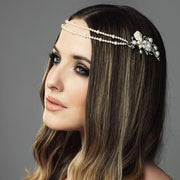 This double strand hairdrape can be draped towards the back or the front of the head. The combs are sterling silver with pearl and crystal detail. The drape consists of 6mm & 8mm ivory pearl.
