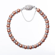 A solid yet elegant Rose Gold 6mm pearl bracelet with crystal detailing in between each pearl with a silver plated magnetic clasp and a sterling silver safety chain.