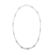 An elegant but charming necklace which compromises of 6mm ivory pearls and 6mm silver plated Rondelles and 6mm silver plated balls finished with sterling silver findings. Can be made in a range of different colours and sizes.