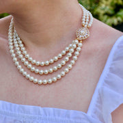 Our Margo Triple Necklace is a elegant pearl triple strand necklace with elegant crystal detailing on one side of the neck. This necklace consists of 6mm pearl and 8mm pearls.