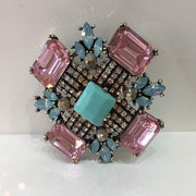 Summer brooch with Pink and Blue coloured gemstones with matte blue center and crystal surround. Fabulous on a bag, hat or piece of clothing.