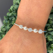 This elegant and radiant crystal and pearl sterling silver bangle is made using genuine rhodium, sterling silver and Cubic Zirconia.