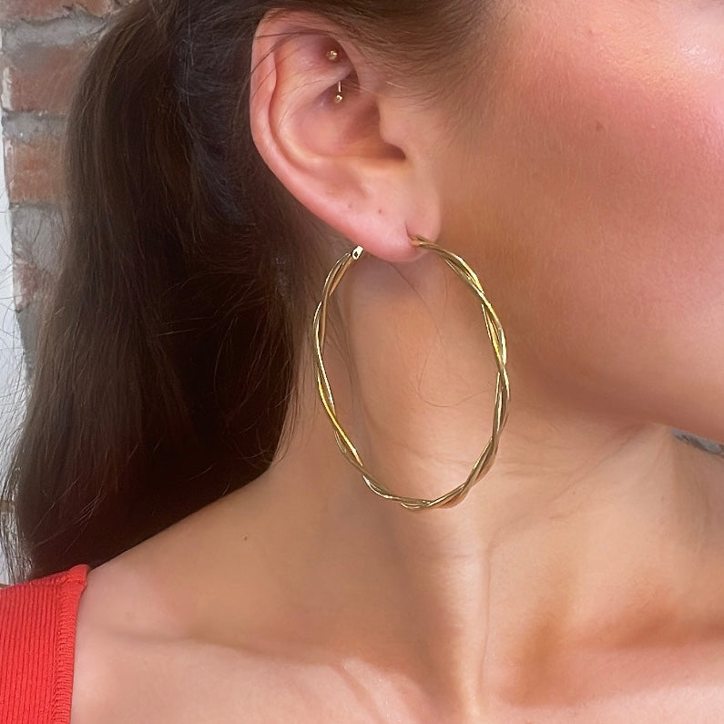 These stunning oversized hoop earrings are the ultimate statement piece, combining boldness with timeless elegance. Their standout size and sleek design make them the perfect hoops for adding a touch of glamour to any outfit, whether you're dressing up for a night out or adding flair to your everyday look.