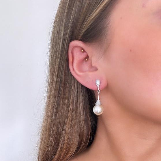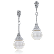 Sterling silver with simulated diamond . Elegant and classic this 12mm pearl earring with crystal detailing is 1.5" in length. Available in Ivory white light pink and light grey .