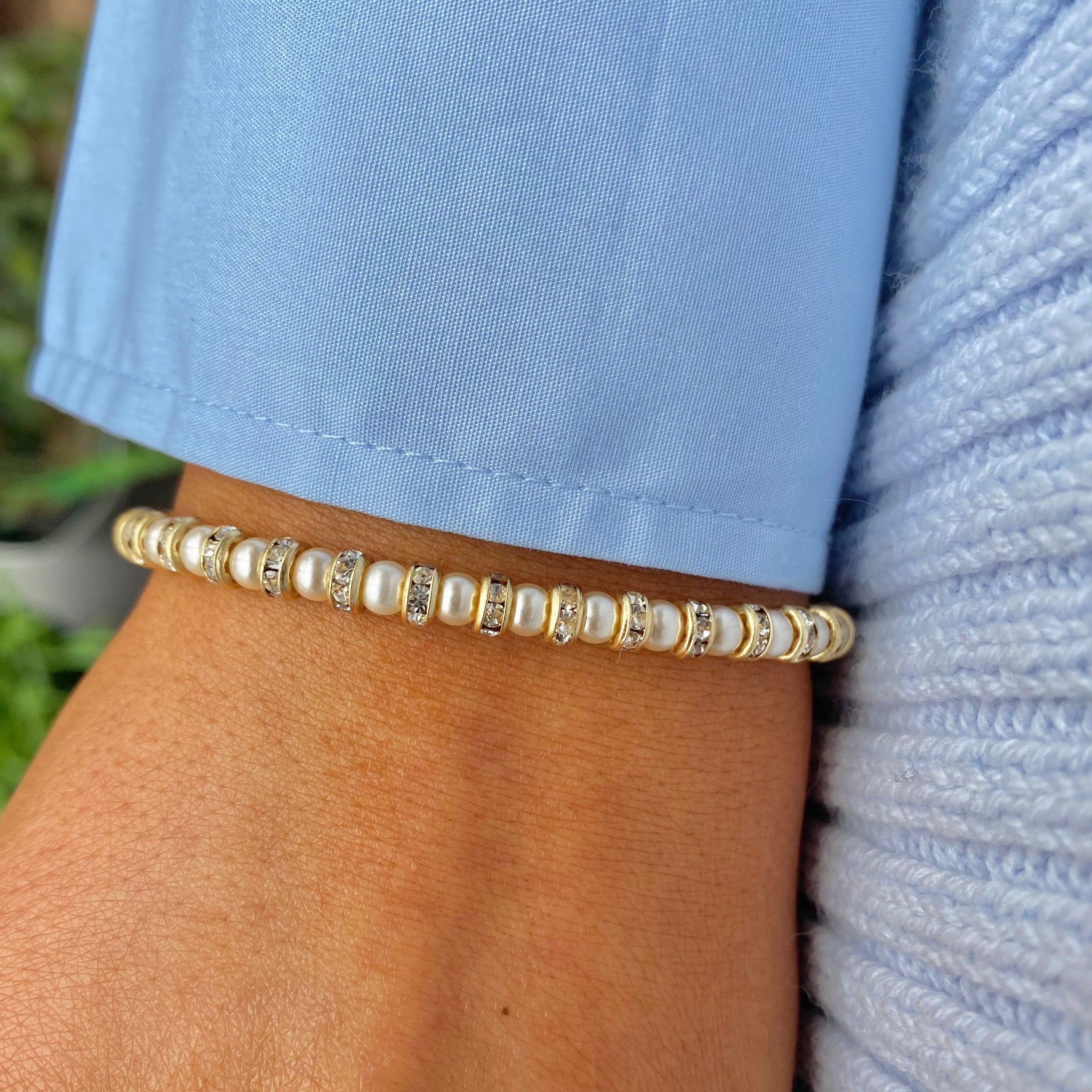 A dainty ivory 4mm pearl bracelet with rondelle crystal detailing in between each pearl. This bracelet is finished with a sterling silver gold plated lobster clasp. Other sizes and colours of this handmade bracelet are available. Please refer to our pearl chart and contact us to design a bespoke piece. The simplicity of this design makes this bracelet timeless allowing countless wears.