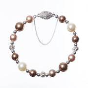 This bronze, almond and ivory handmade bracelet consists of 8mm & 10mm pearls, 6mm crystal disco balls and silver plated 4mm beads. This bracelet is simple with a contemporary twist.