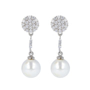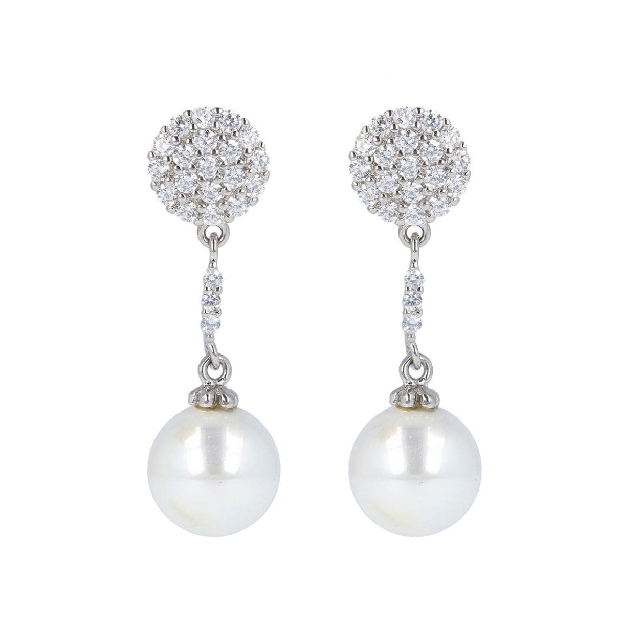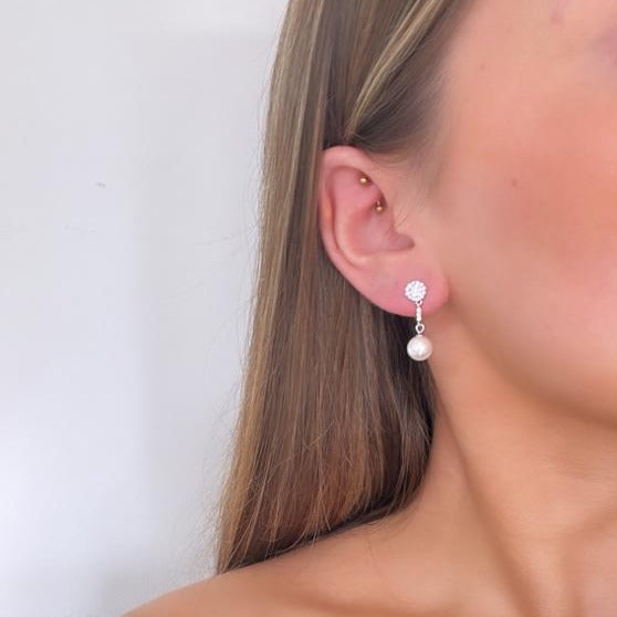 A subtle earring consisting of an 10mm white pearl drop with a cubic crystal top 8mm in size.
