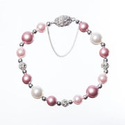 This powder rose, rosalie pink and ivory handmade bracelet consists of 8mm & 10mm pearls, 6mm crystal disco balls and sterling silver 4mm beads. Bracelet is finished with a sterling silver magnetic clasp and safety chain.