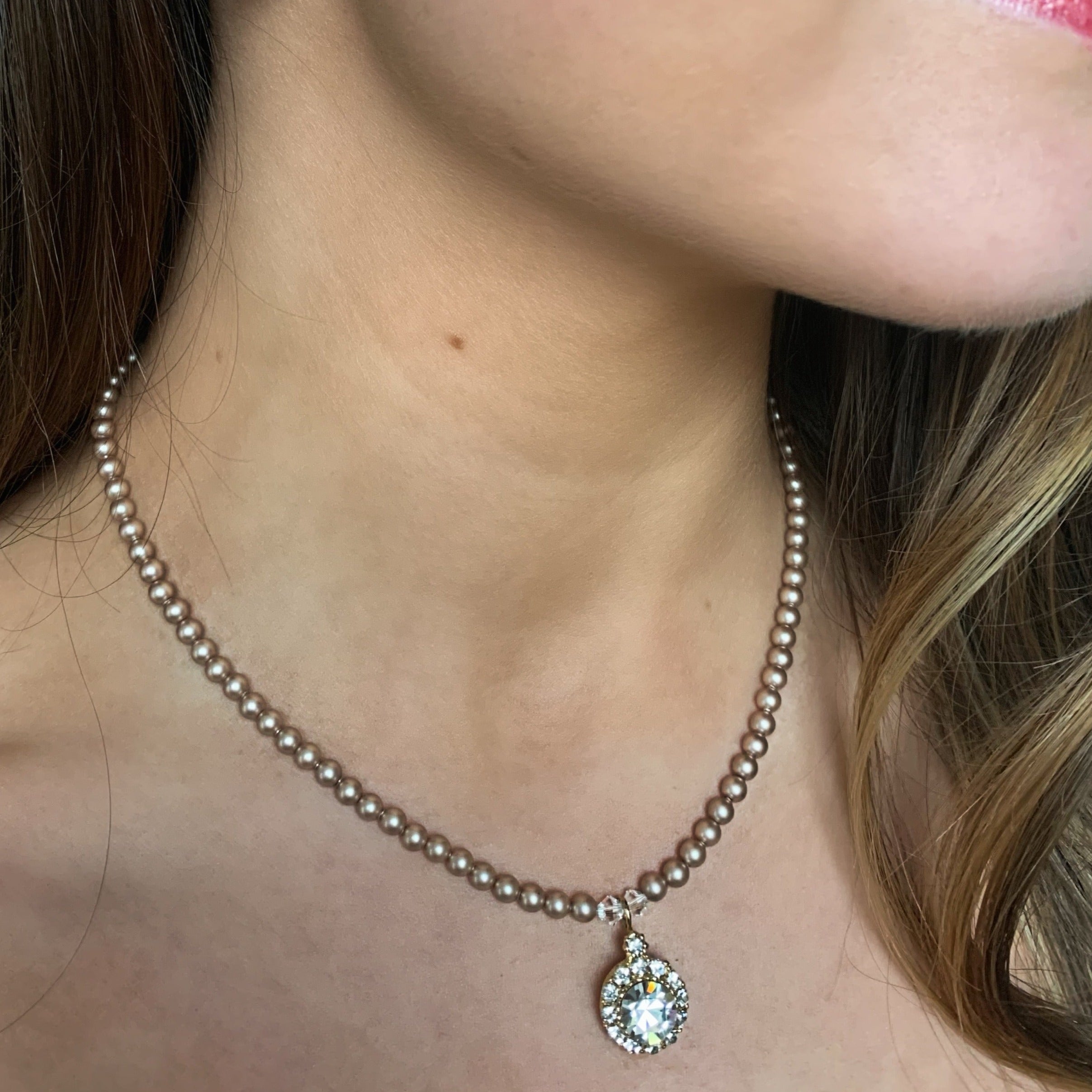 This gorgeous 4mm pearl necklace with vintage style pendant comes in a variety of combinations. This combination is Almond pearl with gold and crystal pendant. This piece is perfect for casual or evening wear. A stunning gift or as a treat.